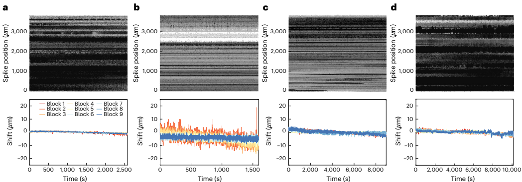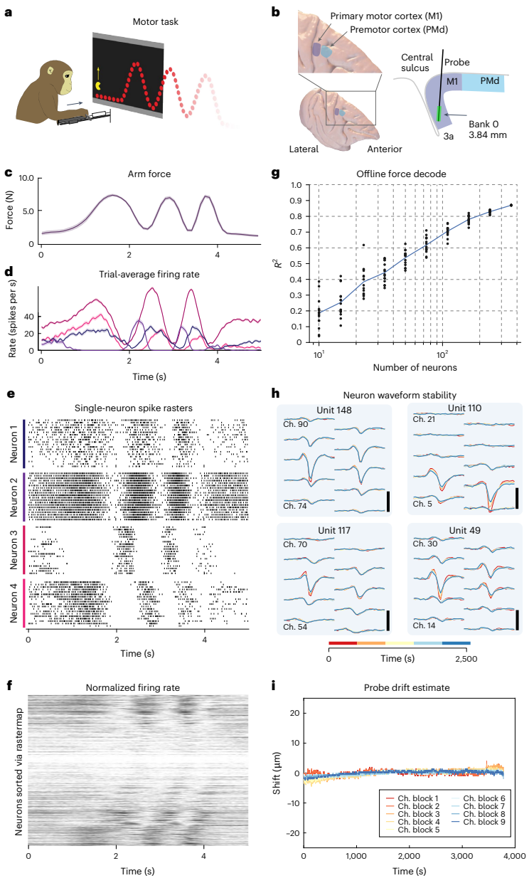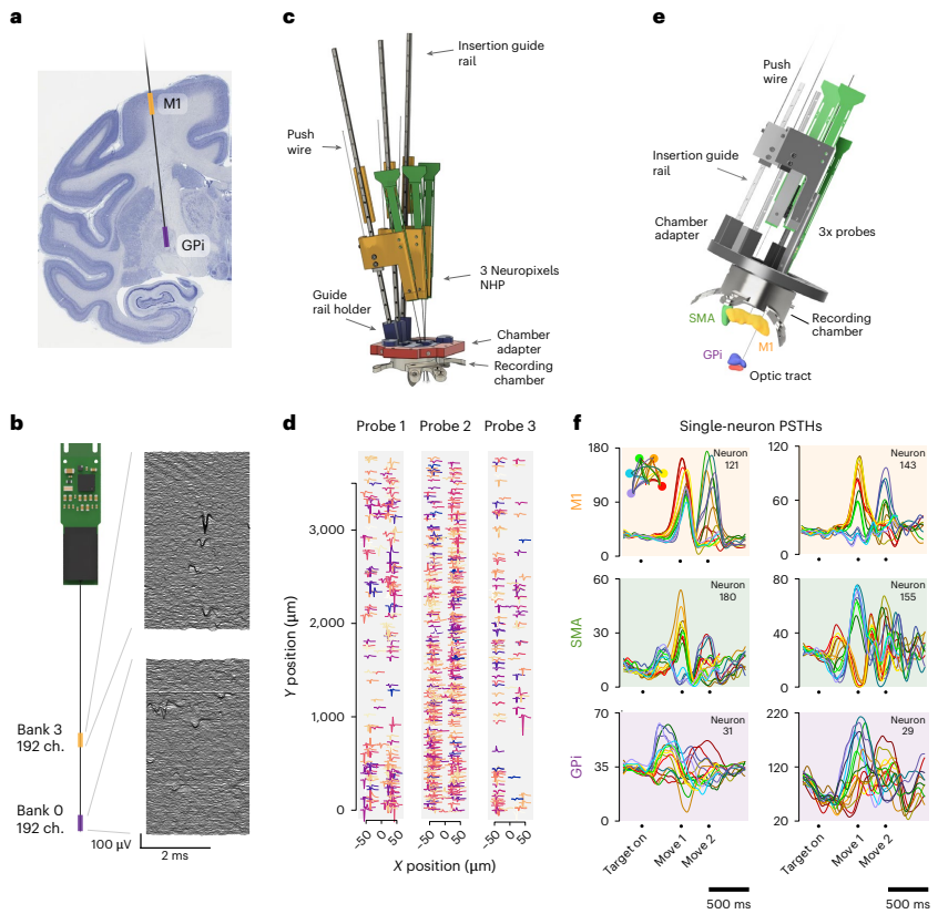 4)实现4416记录位点中384通道可编程选择。这些创新使单探针即可覆盖猕猴全脑深度,在视觉皮层成功记录3029个神经元,运动皮层实现673神经元同步记录,创造了NHPs电生理记录的新纪元。